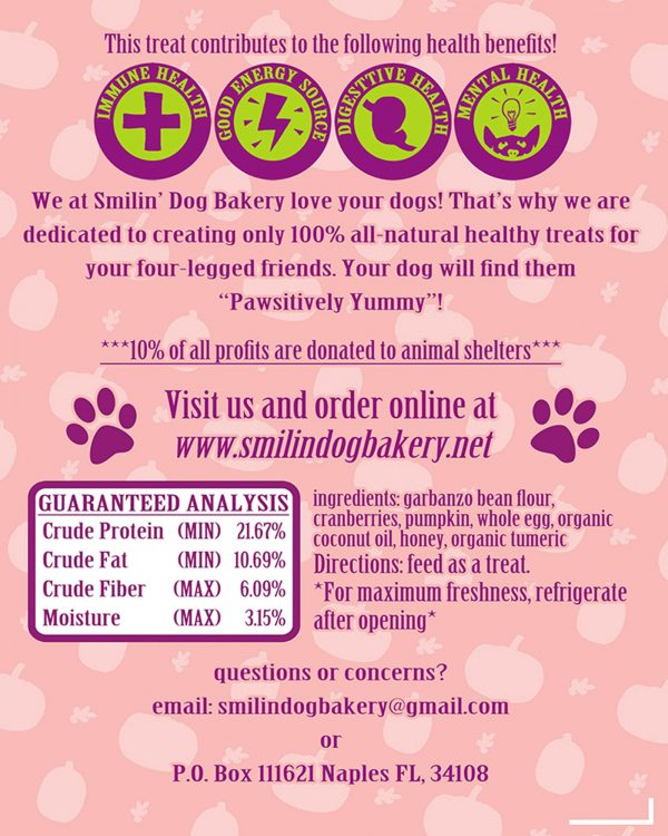 Ingredients: Bob’s Red Mill all-natural chickpea flour, fresh cranberries, organic pumpkin, whole egg (including the shell, finely ground for added calcium benefit), organic coconut oil, raw Florida honey, organic turmeric. 100% all-natural grain-free