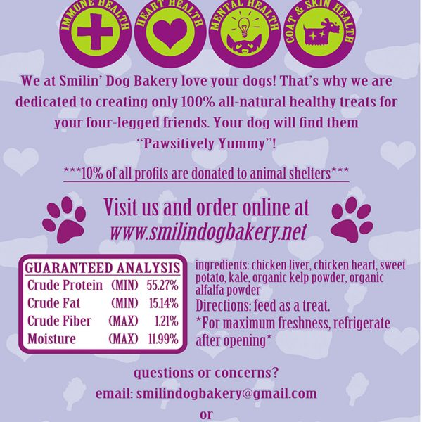 100% all-natural grain-free This is a new recipe we are very excited about, they have been tested by my 3 dogs and I got 2 paws up! These liver snack dog treats are very appealing for finicky dogs and a favorite of small dog owners. The nutrient-dense organs provide protein, B vitamins, vitamin A, zinc, iron, niacin, copper and phosphorus. Chicken livers are a good source of omega-3 and omega-6 fatty acids, and amino acids vital to your dog’s health. These also make excellent training treats because of their smelly taste that your dog will flip over!