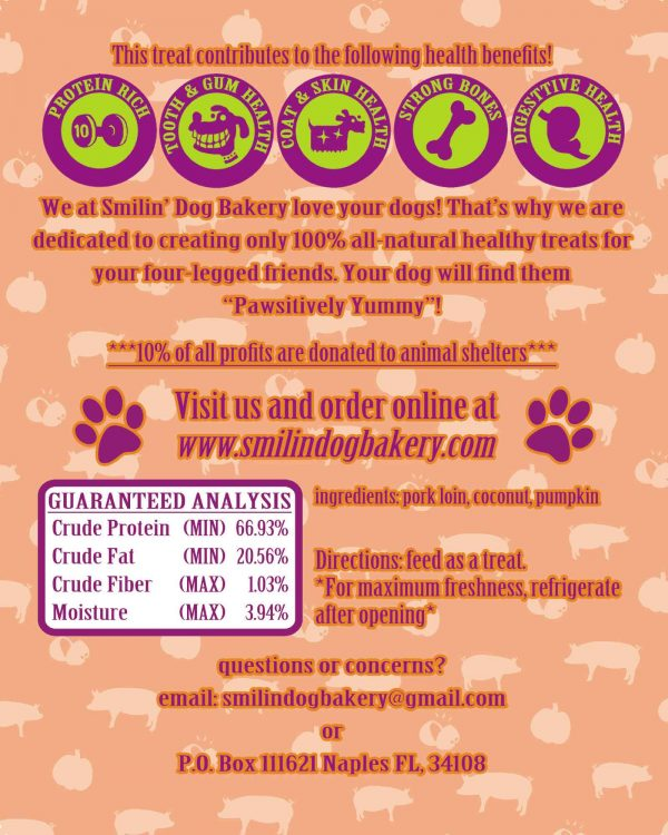 Introducing our latest treat Nutty Pig and the dogs are saying “YUM GIVE ME ANOTHER”! This tasty treat is made with lean pork, pumpkin and fresh ground coconuts! You will be tempted to try one yourself when you hear that yummy crunch from your furry BFF! Better buy two because your dog WILL LOVE THEM!!
